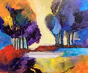 Een semi-abstract landschap,in de kleuren blauw,paars ,rood en geel.Er zijn diverse structuren aan gebracht en diverse materialen in verwerkt.