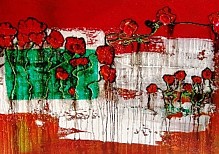 Geschilderd met acryl op linnen, de bloemen afgewerkt met giethars. Daarna varnish voor behoud van de heldere kleuren. Inclusief ophangsysteem en bezorging gratis binnen Nederland. Afgeprijsd i.v.m. plaatsmaken in atelier.