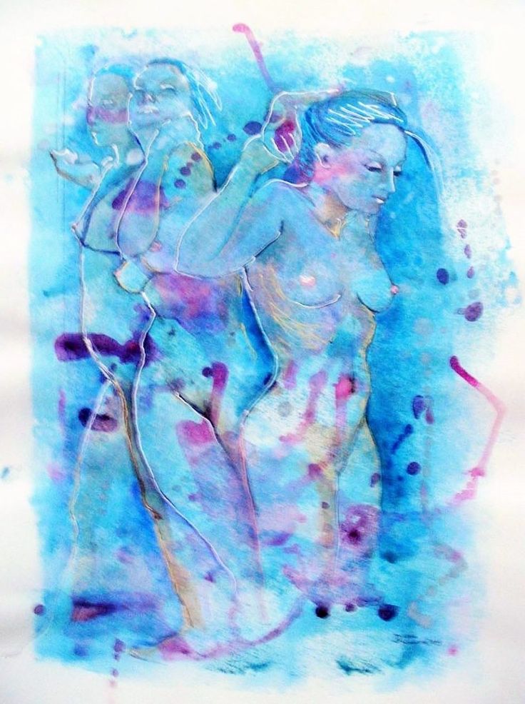 Getekend naar levend model, op zwaar wit papier, met acryl, potlood en later de lijnen opgehoogd met acryl.